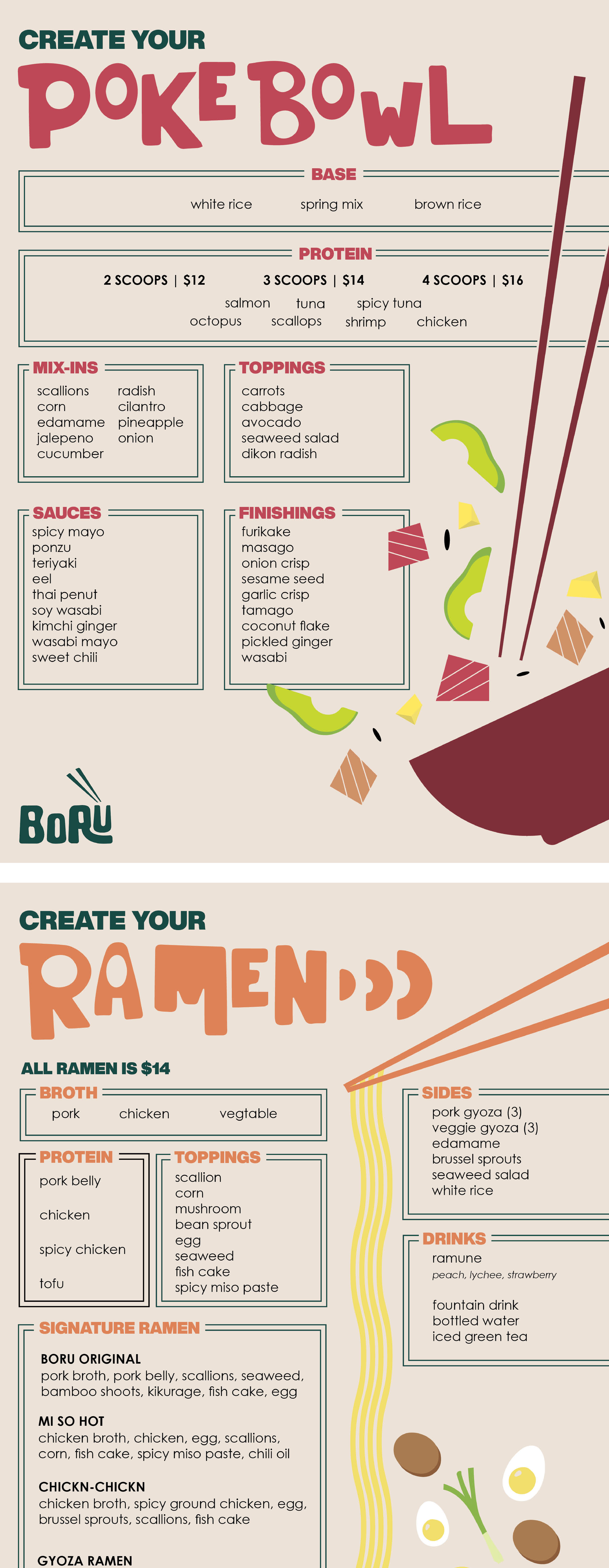 Logo and menu rework for Boru Ramen Noodle & Poke Bar in Kennesaw, GA.