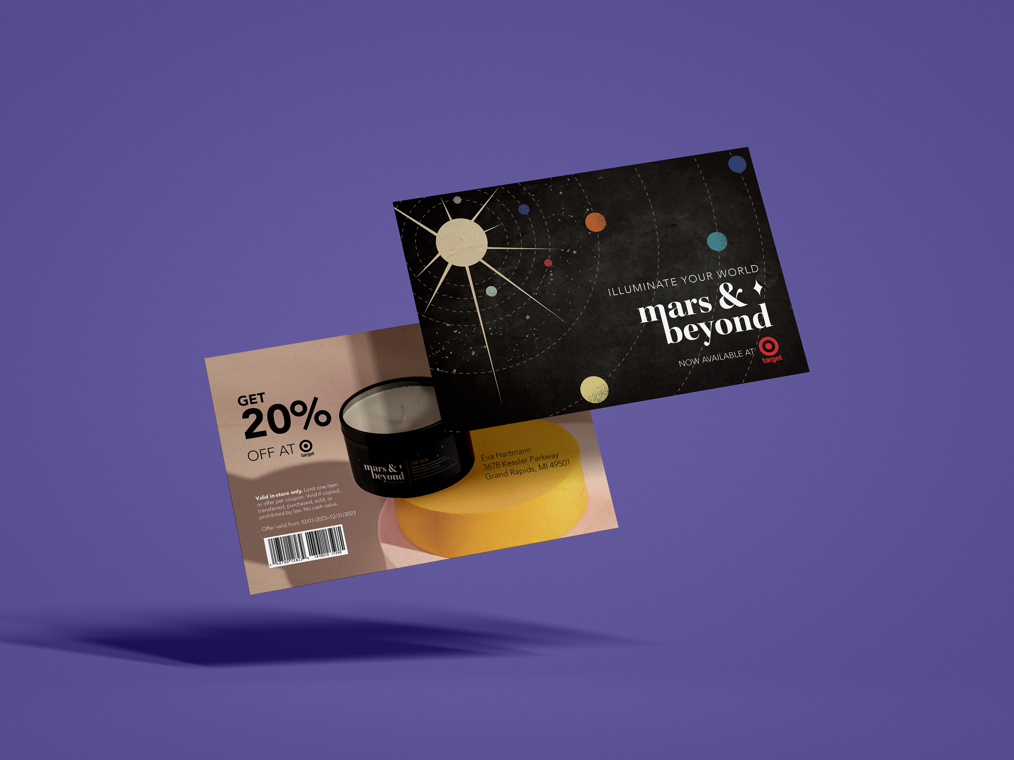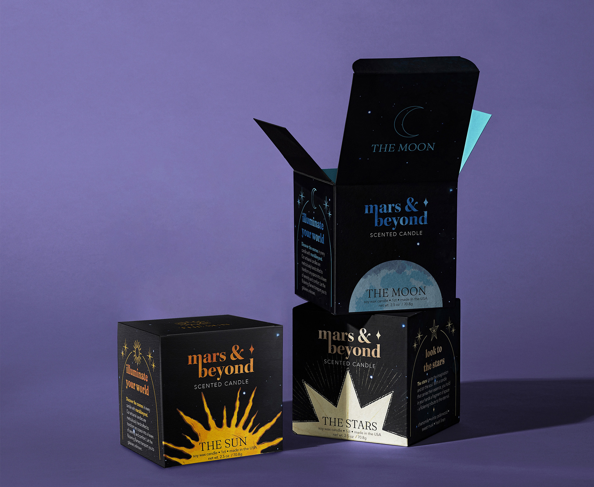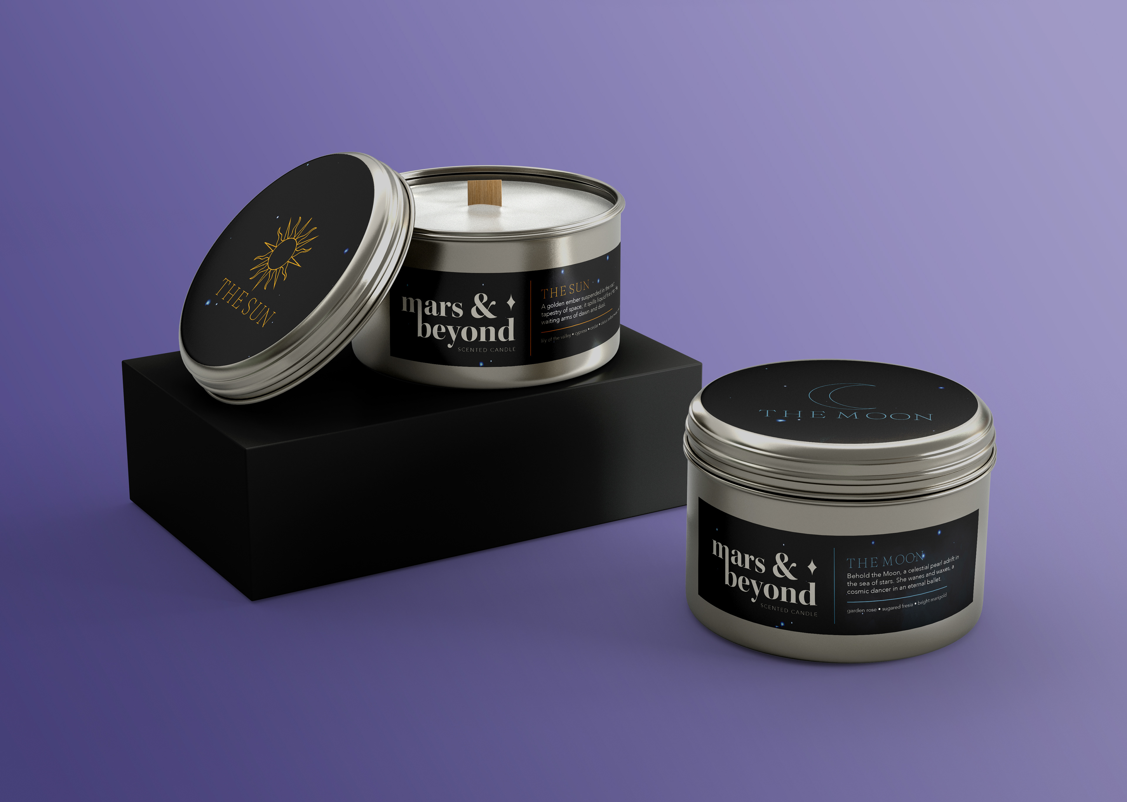 Concept packaging for space-themed candles, inspired by vintage scientific illustrations and diagrams.